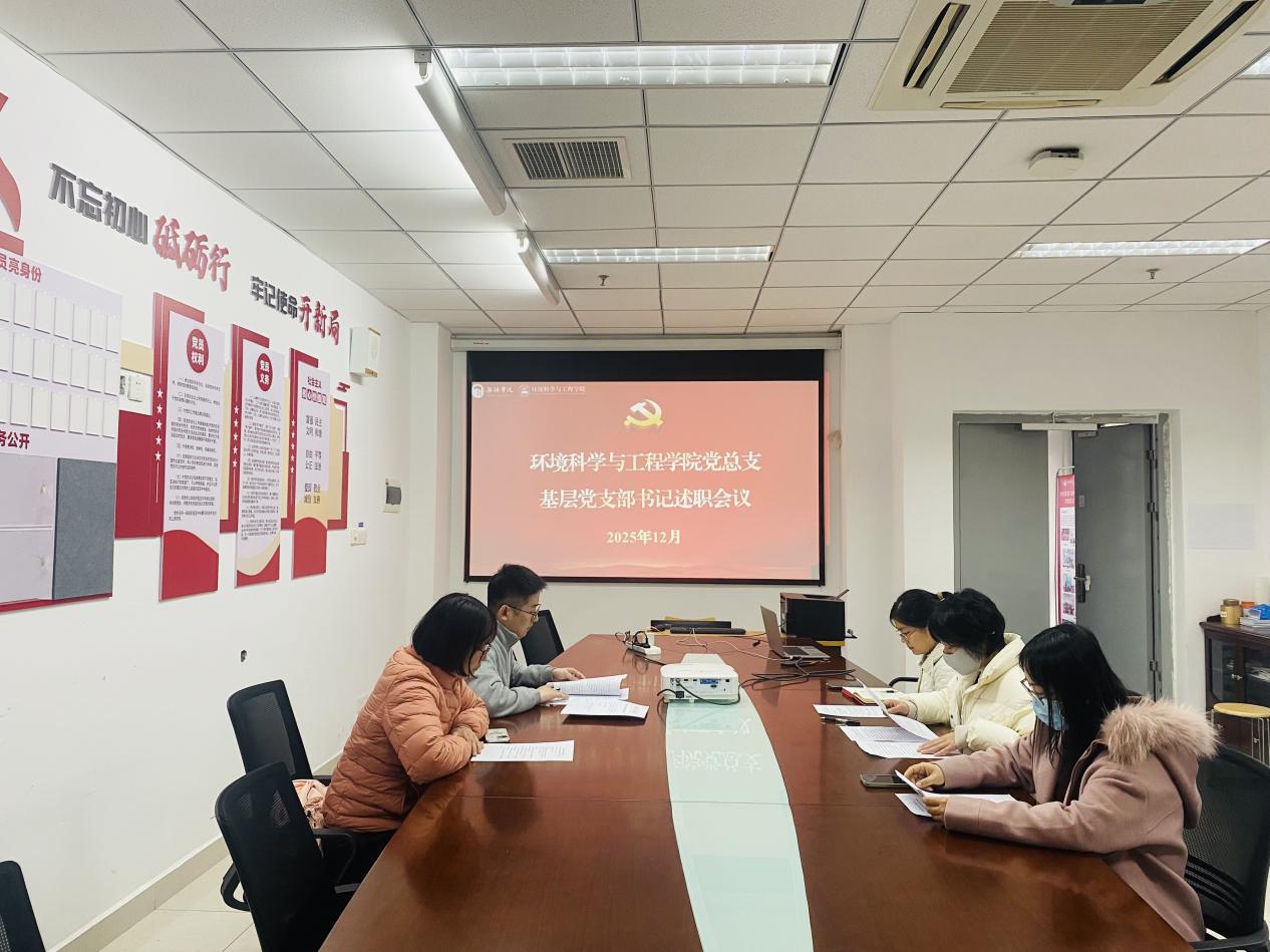 近日,环境科学与工程学院党总支组织召开2025年度基层党支部书记述职评议考核会。学院党总支副书记姜欢主持会议,教工党支部、学生党支部书记进行了现场述职,党总支委员和组织员参加。