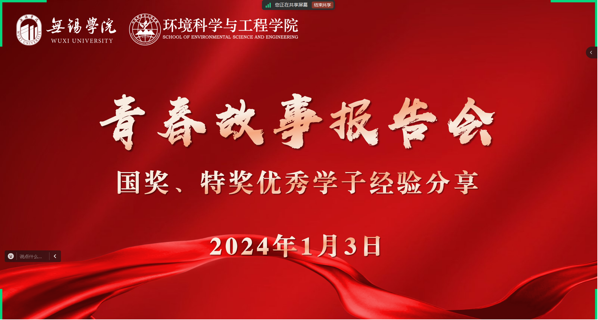 为落实立德树人的根本任务,充分发挥榜样模范的引领作用,营造积极向上的学习氛围,环境科学与工程学院于2025年1月3日19:00 线上举办了“青春故事报告会”优秀学子经验分享会。此次分享会特邀物联网工程学院国家奖学金获得者叶宇轩、本学院国家奖学金获得者赵恩沛以及校特等奖学金获得者刘轩分享经验,全院学生踊跃参与。