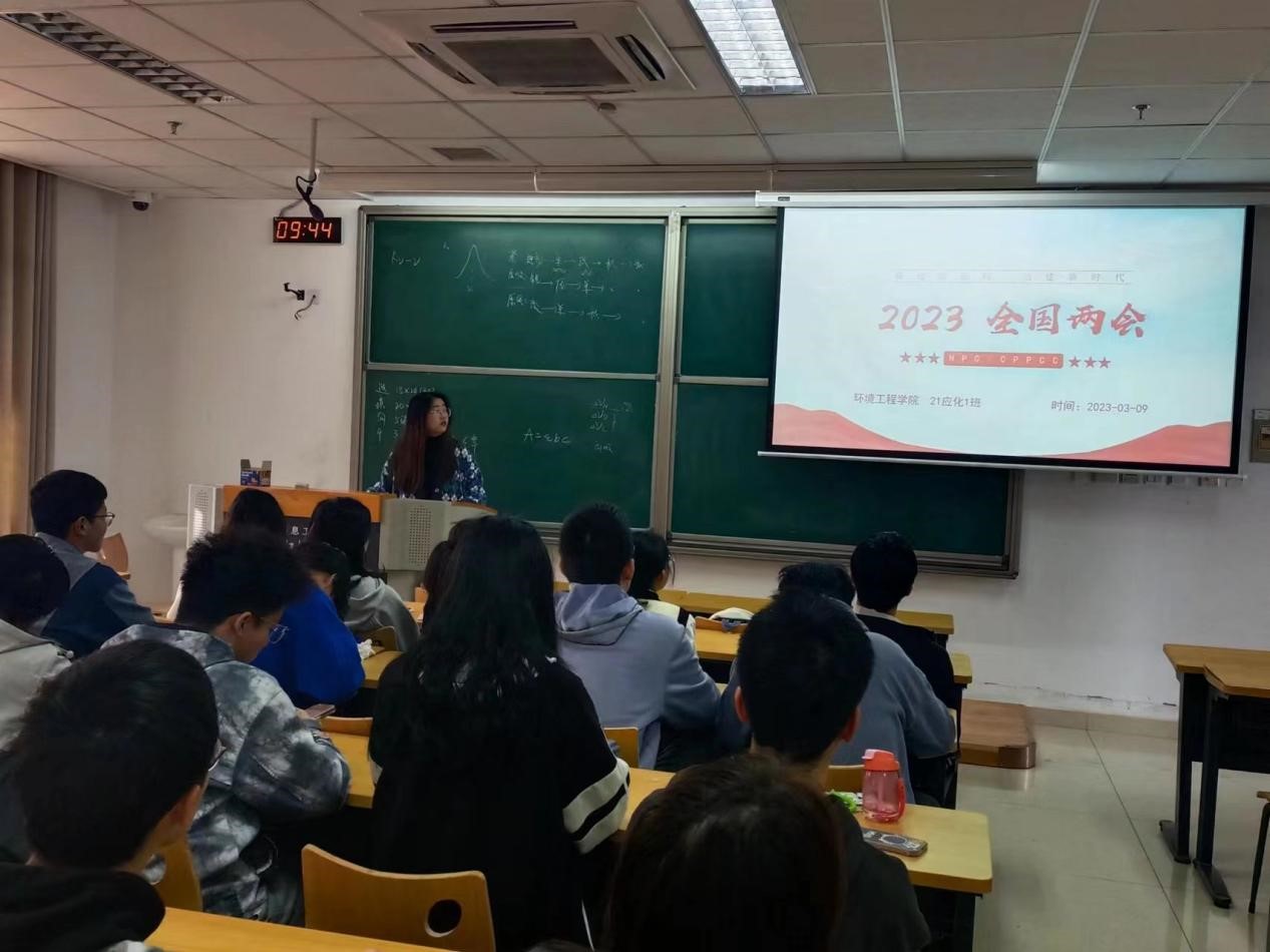 团支书钱云萍用幽默风趣的语言开场,为本次团课带来了轻松愉快的氛围。会上,钱云萍首先带领大家认真学习了政府工作报告,展示了两会的新闻图片和短视频,让同学们更加直观地了解两会的盛况和重要议题。同学们积极参与讨论,热烈表达他们对于两会的关注和理解。此外,钱云萍还为大家播放了生态环境部部长黄润秋答记者问的采访实录,引领同学们积极探讨关于应对气候变化、推动可持续发展等议题。同学们提出了许多切实可行的建议,例如鼓励使用环保袋、节约用水、减少碳排放等,以实际行动保护环境。
