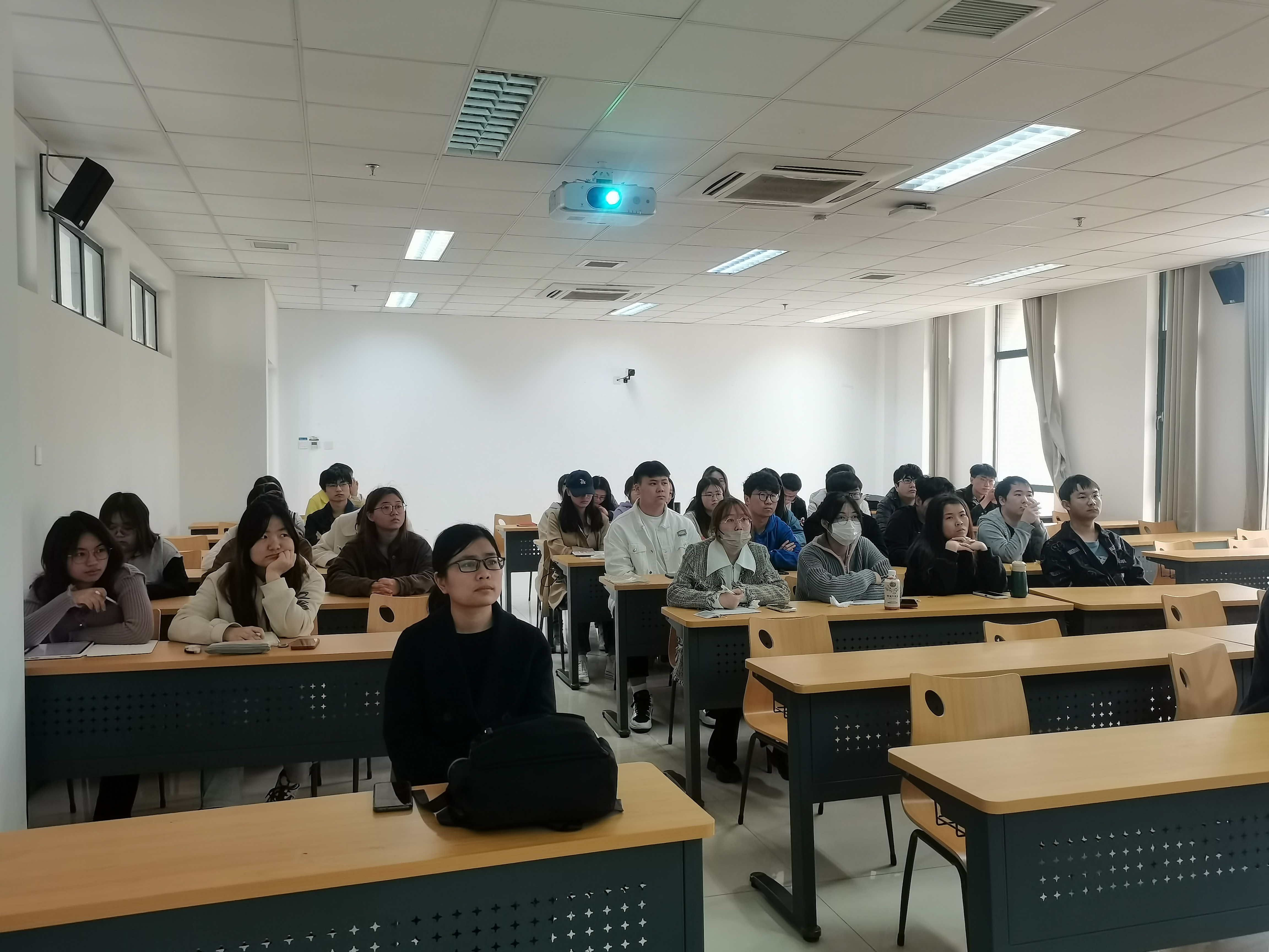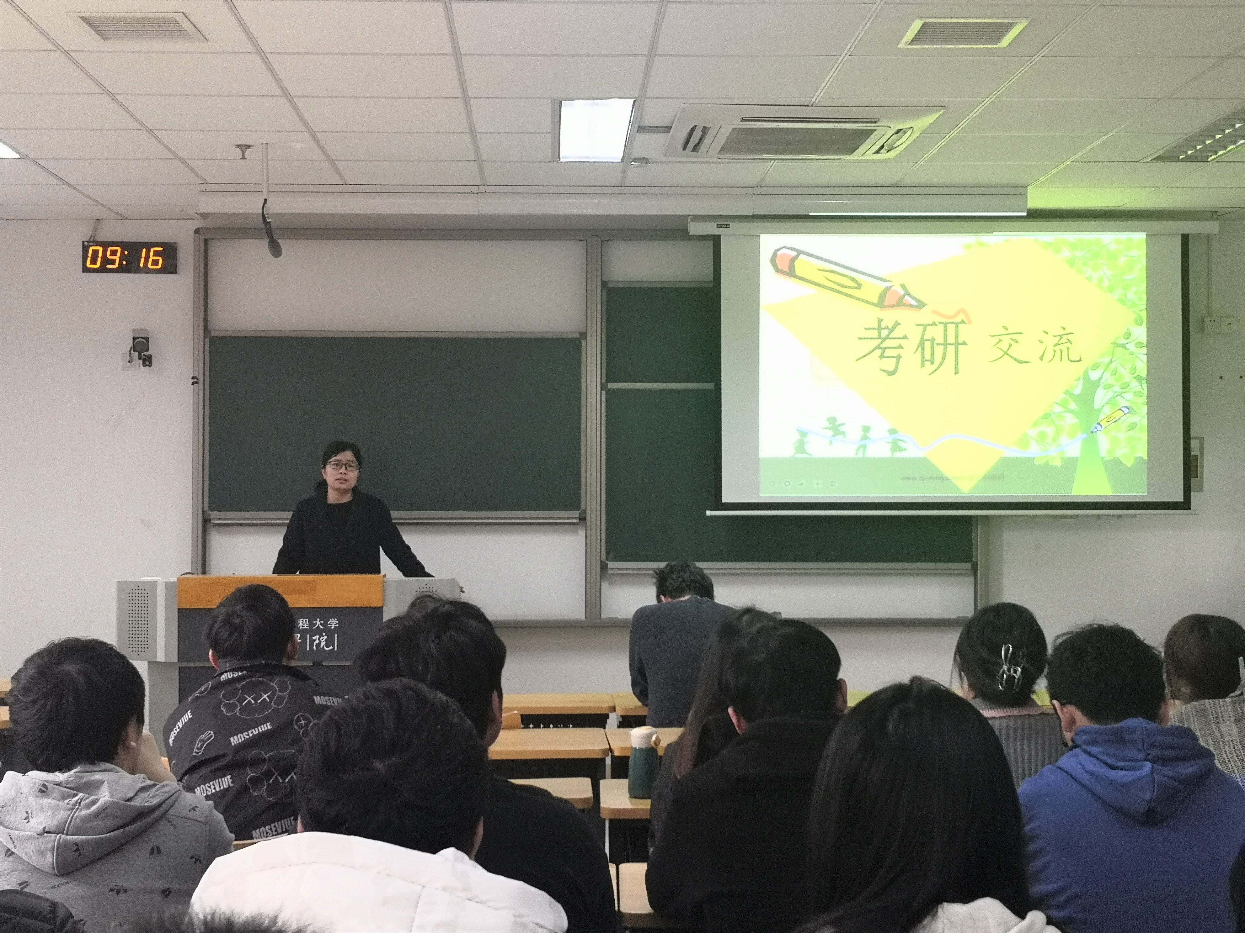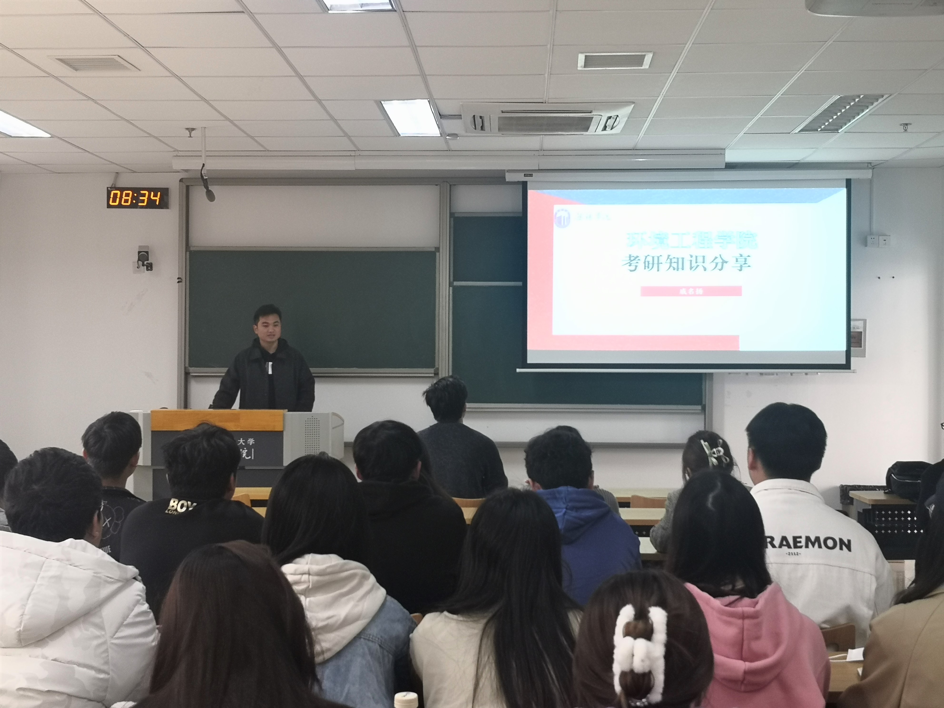 辅导员戚名扬为同学们详细介绍了当前的考研形势、考研分数线要求、考研信息搜集方法以及报名方式等内容。结合考研学子的主要困惑和关注信息,进行了现场演示和解读。同时,戚名扬老师结合自身经历,叮嘱同学们要提前制定计划,坚持到底,拼搏向上。