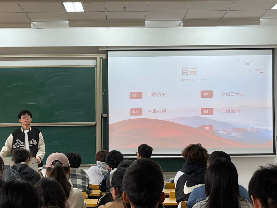 本次活动分为三个部分。第一部分、回顾党史,介绍大会。由团支书刘畅带领大家回顾百年党史,并介绍中国共产党第二十次全国代表大会的主要议题及会议精神。第二部分、朗读金句,分享心得。班长孙亦膑带头朗读党的二十大报告中的频出金句,“未来属于青年,希望寄予青年。”经此熏陶,同学们自由讨论并发表真挚感想。第三部分、总结强调,贯彻始终。团支书带领班级同学重点学习了10月25日生态环境部召开的干部大会,关注党的二十大精神在生态、环保领域的贯彻落实情况。