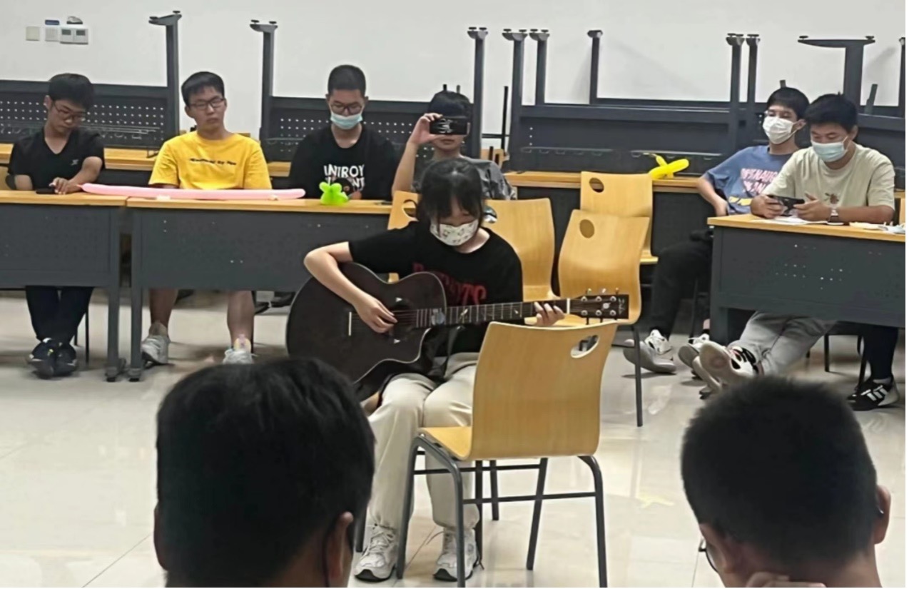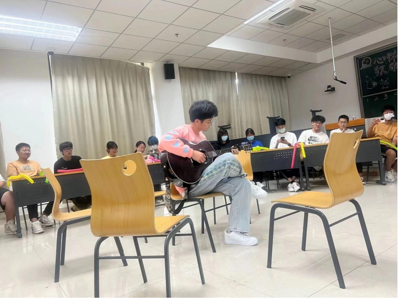伴随着同学们的欢呼声,费越同学的吉他弹唱、辅导员马老师的歌曲演唱、孔祉晗同学带来的才艺展示,赢得在场观众的阵阵掌声。
