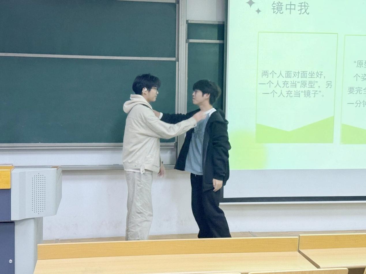培训结束后,学院开展了形式新颖、内容丰富的心理团辅活动,由邹子涵同学担任主持人。通过“情绪接力赛” “镜中我” “如果我是一个动物”等一系列互动游戏,同学们在轻松愉快的氛围中增强了对表情与肢体语言的解读能力,提升了对情绪的觉察力与共情力,进一步促进了自我认知与彼此理解。