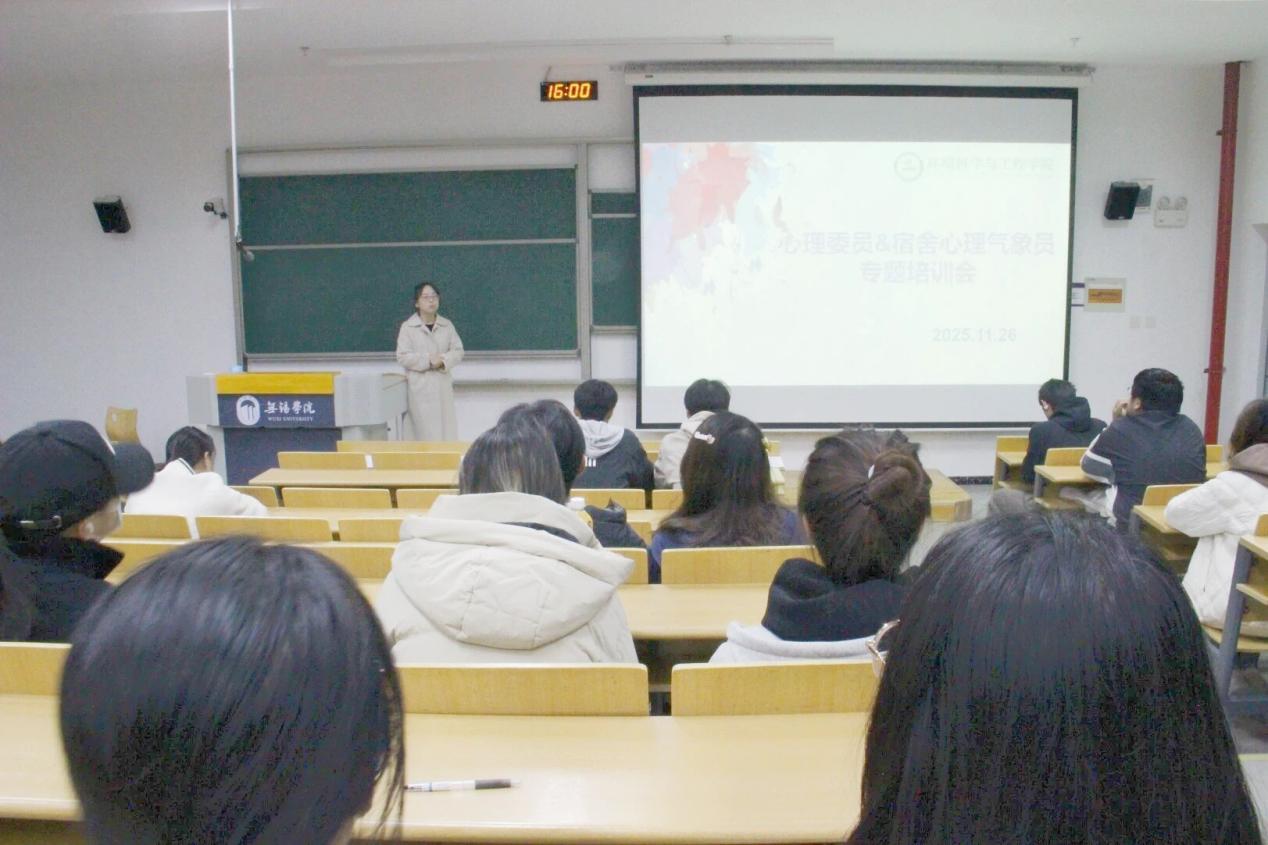 为完善学院心理健康支持体系,提升朋辈心理骨干的助人能力与责任意识,2025年11月26日,环境科学与工程学院在尚美楼106成功举办了心理委员、宿舍心理气象员专题培训会暨“心灵同行,共筑健康”主题心理团辅活动。本次培训由学办主任马丽娜主讲,活动由院学生会主办。