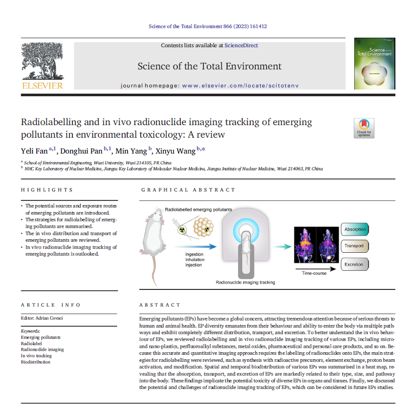 近日,我院范叶丽老师在环境科学与生态学1区期刊《SCIENCE OF THE TOTAL ENVIRONMENT》(IF: 10.753)发表题为“Radiolabelling and in vivo radionuclide imaging tracking of emerging pollutants in environmental toxicology: A review”的论文,概述了放射性核素成像在体内追踪新型污染物的发展和应用。
