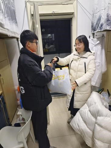 2月12日下午,学院辅导员戚名扬和班主任走访宿舍,亲切慰问学生,关怀学生的寒假生活以及新学期的学习规划,宿舍居住环境等事宜。学院分团委书记马丽娜为家庭困难学生送上冬季暖心慰问礼品。