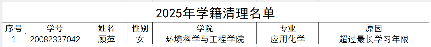 关于环境科学与工程学院本科生学籍清退公告根据《南京信息工程大学滨江学院学籍管理办法》相关规定,学生在籍学习时间(含休学)最长不得超过8年,经学校教务处核查,原南京信息工程大学滨江学院环境科学与工程学院学生顾萍存在在籍时间超过学校规定最长学习年限8年的情况,且未在规定时间内办理相关手续。
