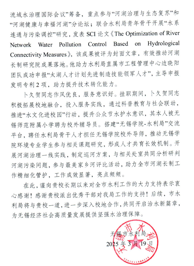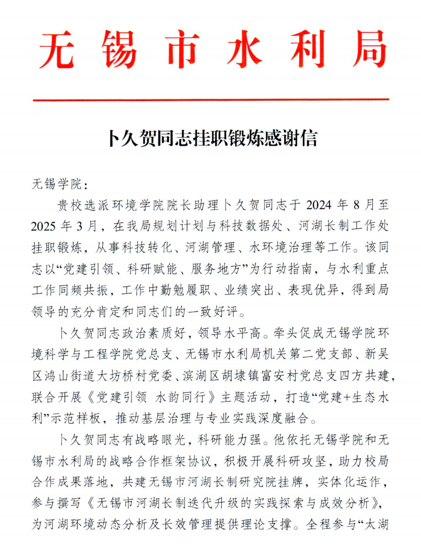 近日,无锡市水利局向我校发来感谢信,感谢我校委派卜久贺同志到无锡市水利局支持工作。