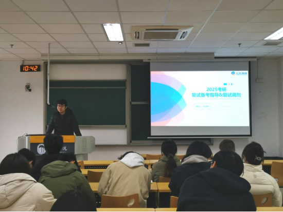 学院特邀考研指导教师朱佳鸣开展讲座,围绕复试调剂流程、复试注意事项、调剂信息收集等方面进行宣讲。他着重提醒同学们,务必要深入熟悉并精准掌握目标院校复试大纲、专业课等考核要求,以充分的准备、积极的心态应对复试。