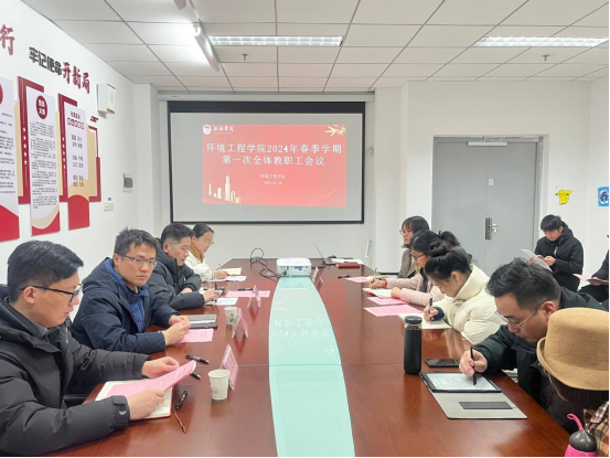 为统一思想,凝聚力量,全面推进新学期工作开展,2月28日下午,环境工程学院在尚诚楼301会议室召开新学期全院教职工会议。院长钱杰书,党总支副书记姜欢,院长助理卜久贺、吴丹及全体教职工参加会议。会议由院长助理卜久贺主持。