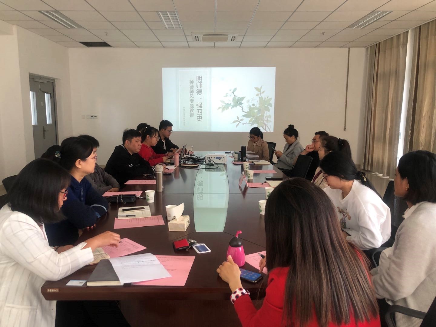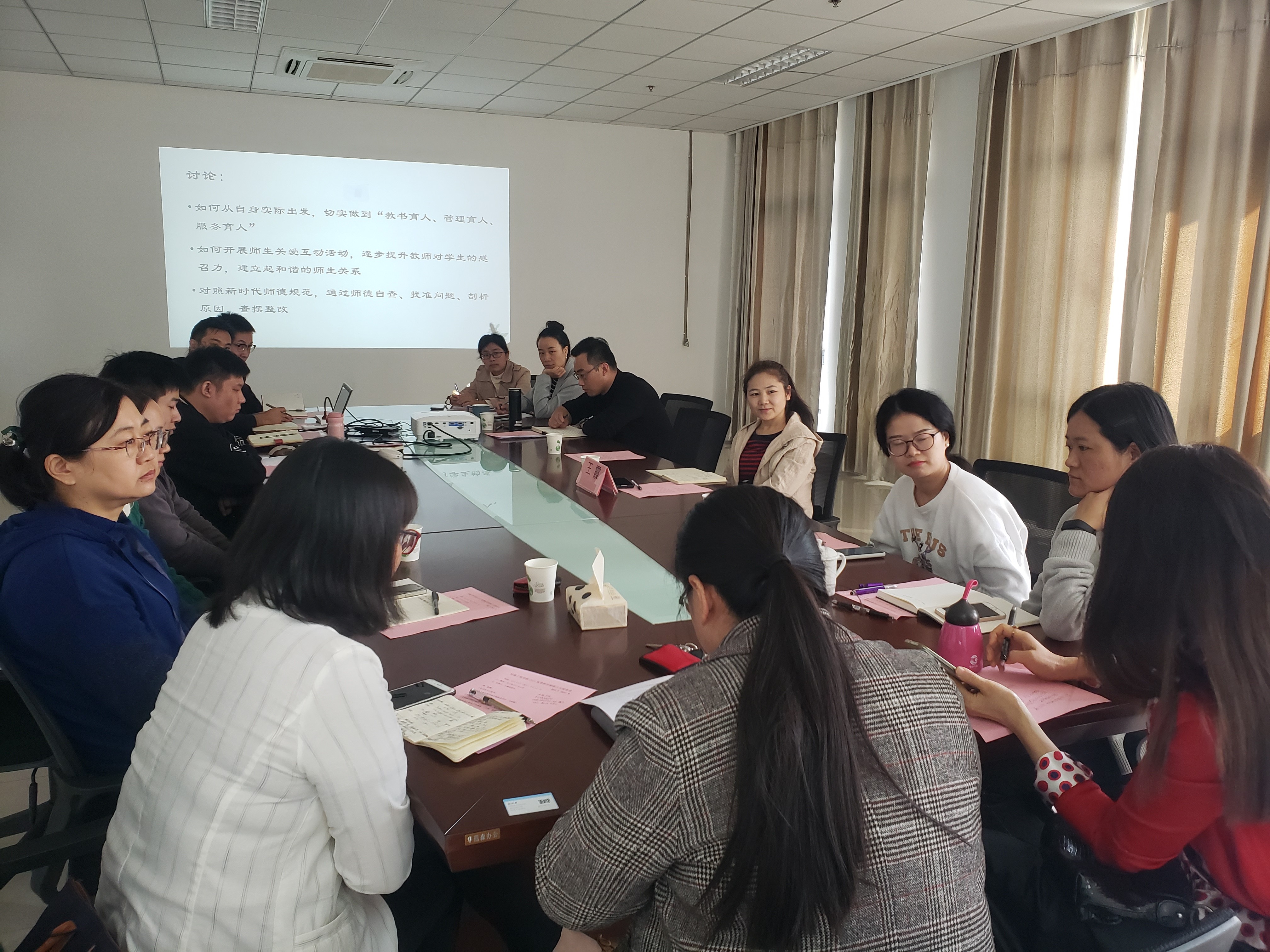 会议开始后,由支部宣传委员马丽娜老师对相关文件材料再次进行了讲解和说明。接着围绕以上文件开展了大讨论,各位老师轮流发言,讨论如何从自身实际出发,切实做到“教书育人、管理育人、服务育人”,如何开展师生关爱互动活动,建立起和谐的师生关系。最后对照新时代师德规范,进行师德自查。