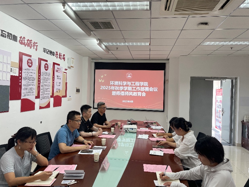为明确工作方向,确保新学期开好局、起好步,紧紧围绕“十五五”规划,扎实推进新学期各项工作有序开展。9月12日中午,环境科学与工程学院在尚诚楼301会议室召开2025年秋季学期工作部署会议暨师德师风教育会。院长钱杰书、党总支副书记姜欢、副院长符波、院长助理卜久贺及学院全体教职工参加会议,会议由姜欢主持。