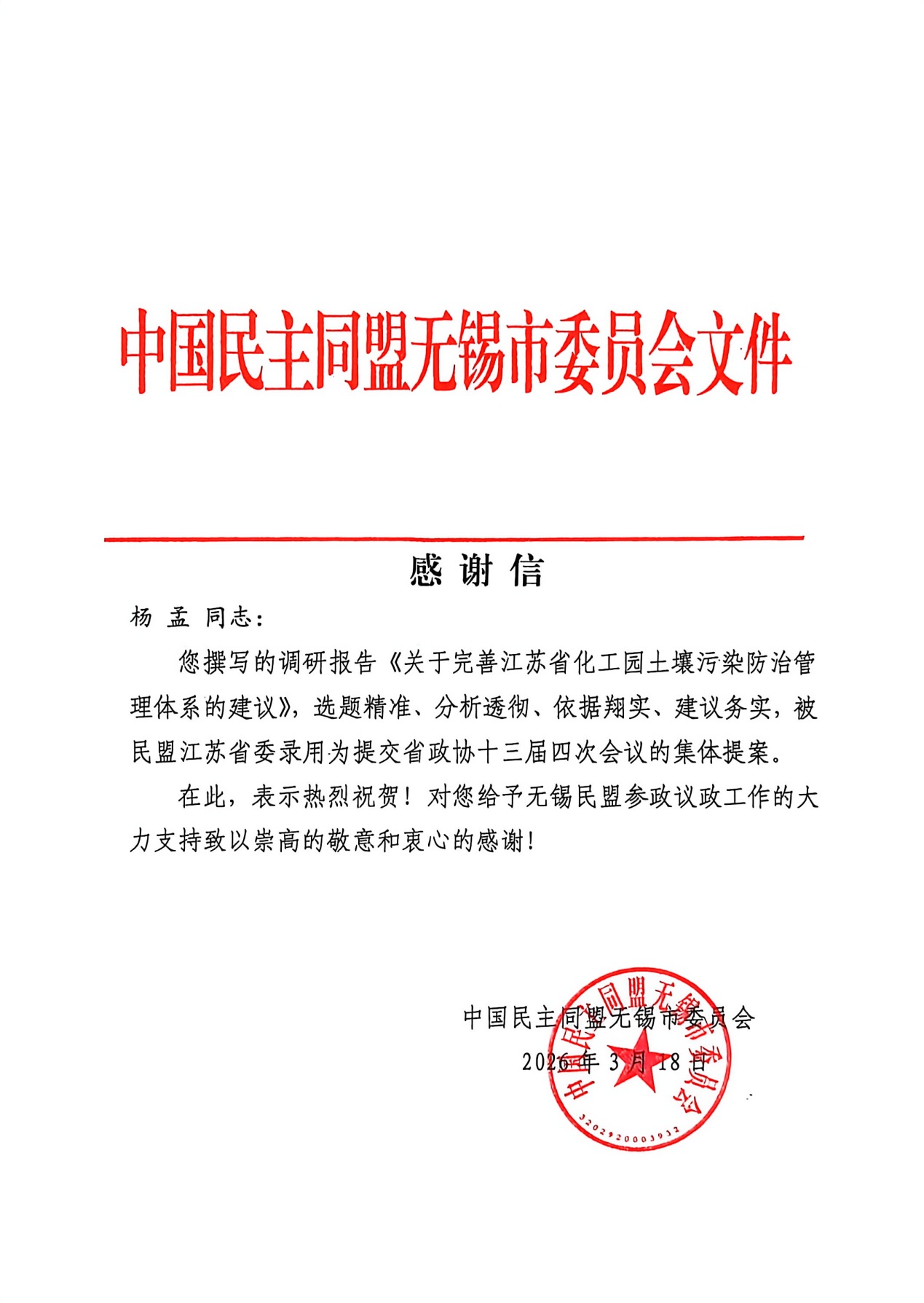 近日,从中国民主同盟无锡市委员会传来喜讯,我院杨孟老师撰写的调研报告《关于完善江苏省化工园土壤污染防治管理体系的建议》被民盟江苏省委录用为提交省政协十三届四次会议的集体提案。民盟无锡市委专门向杨孟老师发出感谢信,对其选题精准、分析透彻、依据翔实、建议务实的调研成果表示热烈祝贺,并对其给予参政议政工作的大力支持致以崇高敬意和衷心感谢。