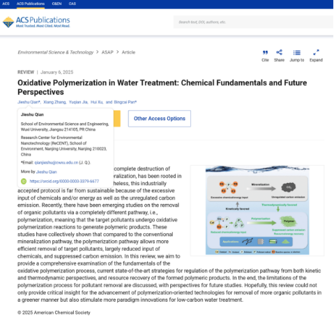 近日,我院水污染控制与资源化团队在自然指数(Nature Index)期刊、美国化学会(ACS)旗下环境领域学术旗舰期刊Environmental Science and Technology发表学术论文《Oxidative Polymerization in Water Treatment: Chemical Fundamentals and Future Perspectives》,原文链接:https://pubs.acs.org/doi/10.1021/acs.est.4c10073?ref=pdf。环境科学与工程学院为第一及通讯单位,显示出我院在环境学科基础研究领域持续取得高水平成果。