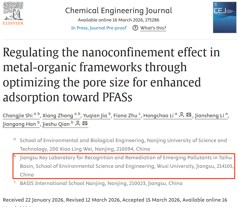 近日,我院水污染控制团队在著名期刊Chemical Engineering Journal(一区TOP期刊,影响因子:13.2)上发表了题为《Regulating the nanoconfinement effect in metal-organic frameworks through optimizing the pore size for enhanced adsorption towards PFASs》的研究论文。太湖流域特征新污染物识别与绿色治理重点实验室、环境科学与工程学院为共同通讯单位。原文链接:https://doi.org/10.1016/j.cej.2026.175286。